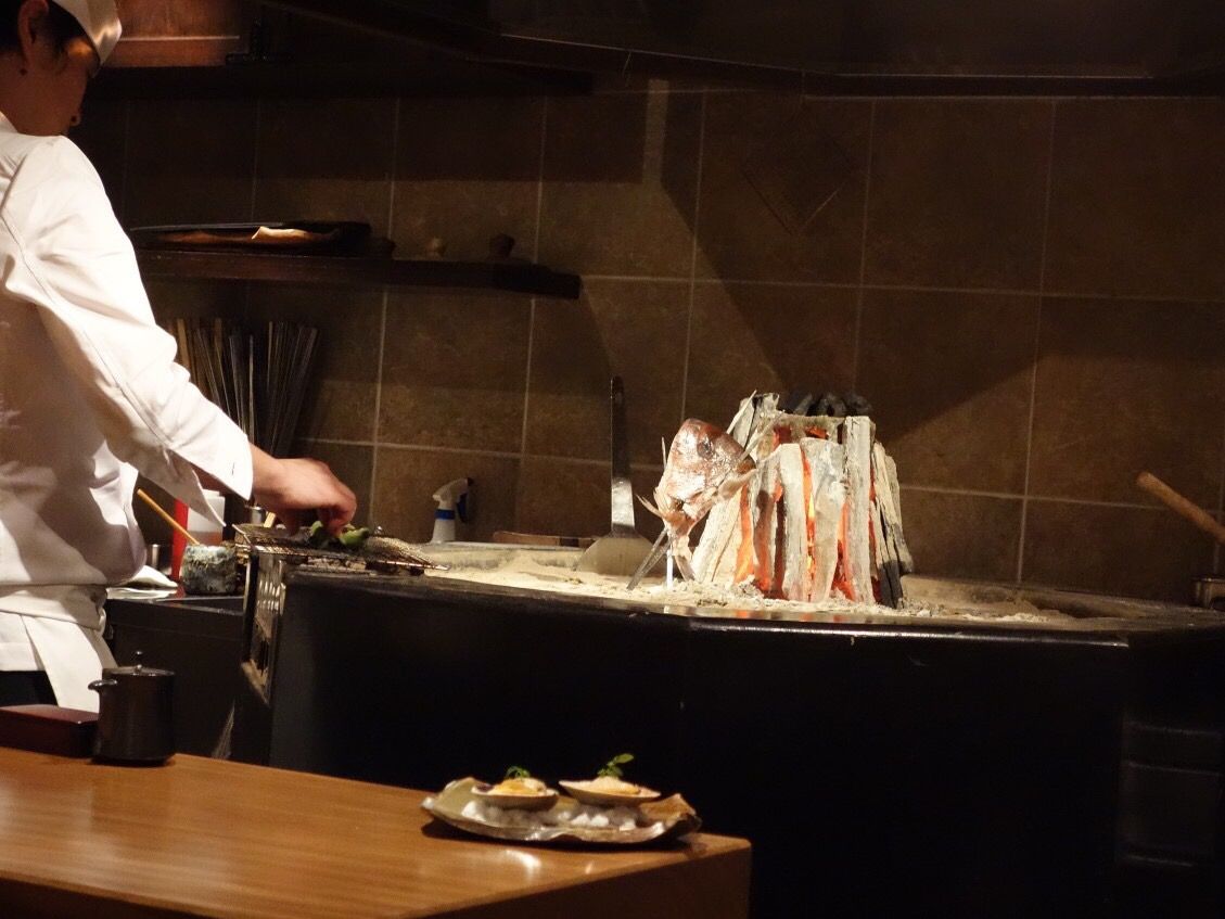 店内には炉端焼きをお客様のみえる目の前で一品ずつ時間をかけて焼いてくれるんです。