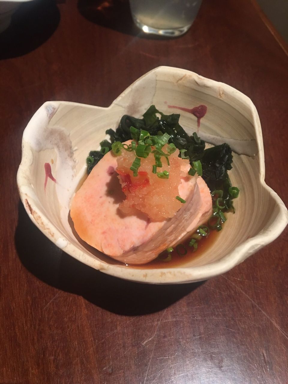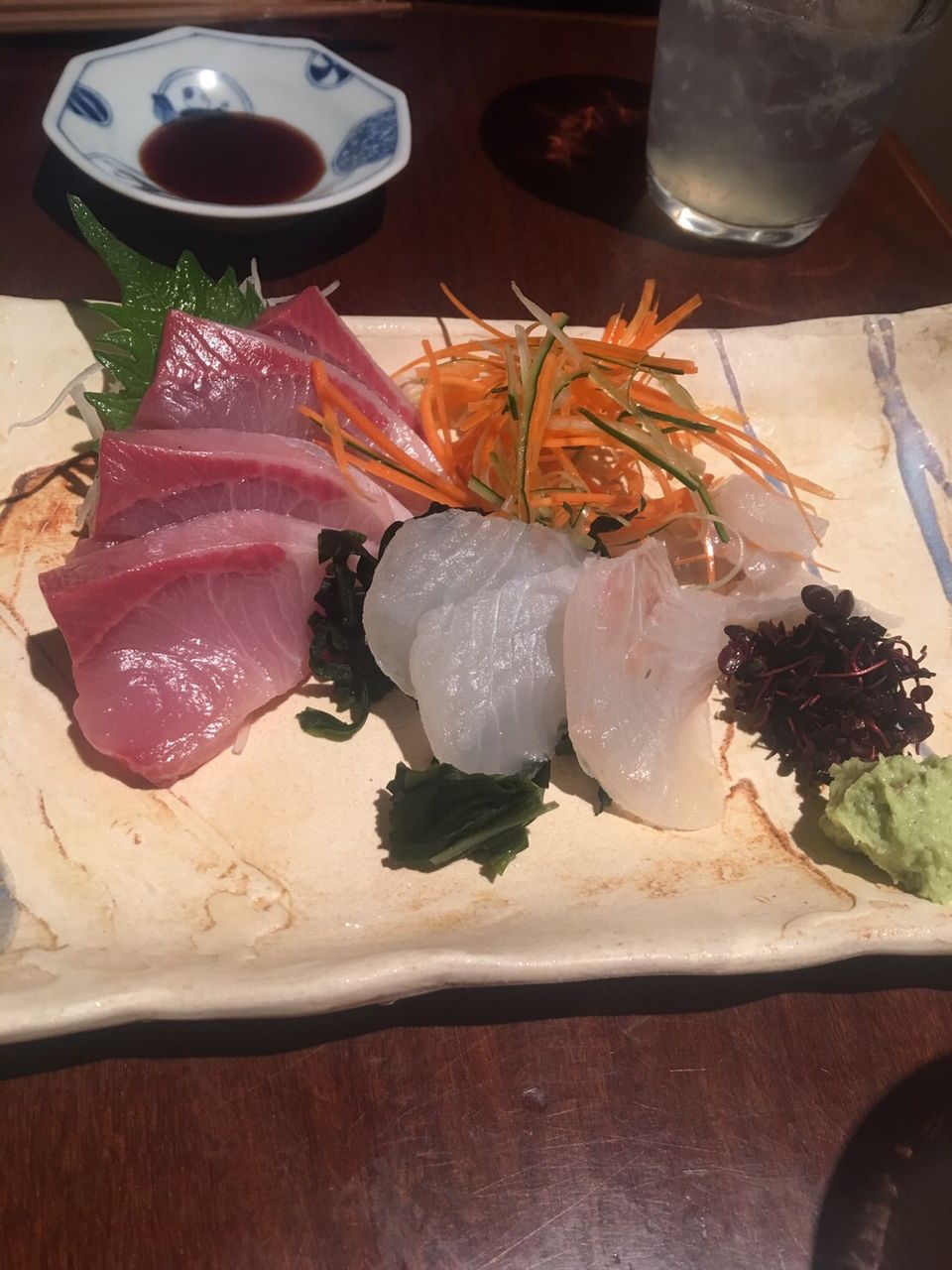 サバの塩焼き、あん肝ポン酢、刺身の三点盛り、